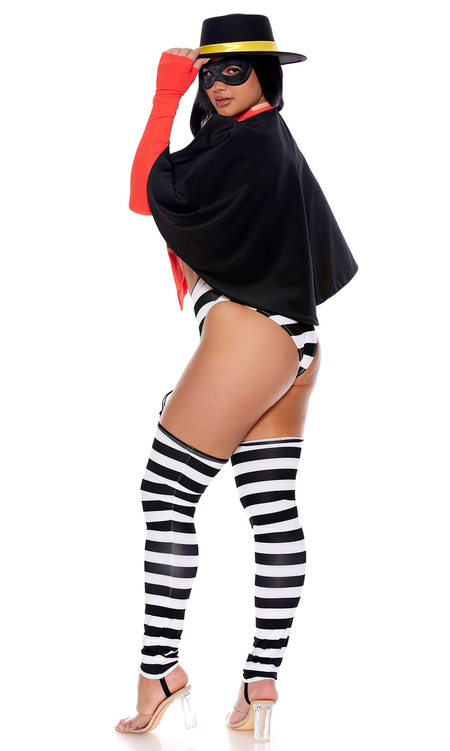 Incluye: Top, Panty con liguero, accesorio para piernas, capa con corbata, antifaz y guantes