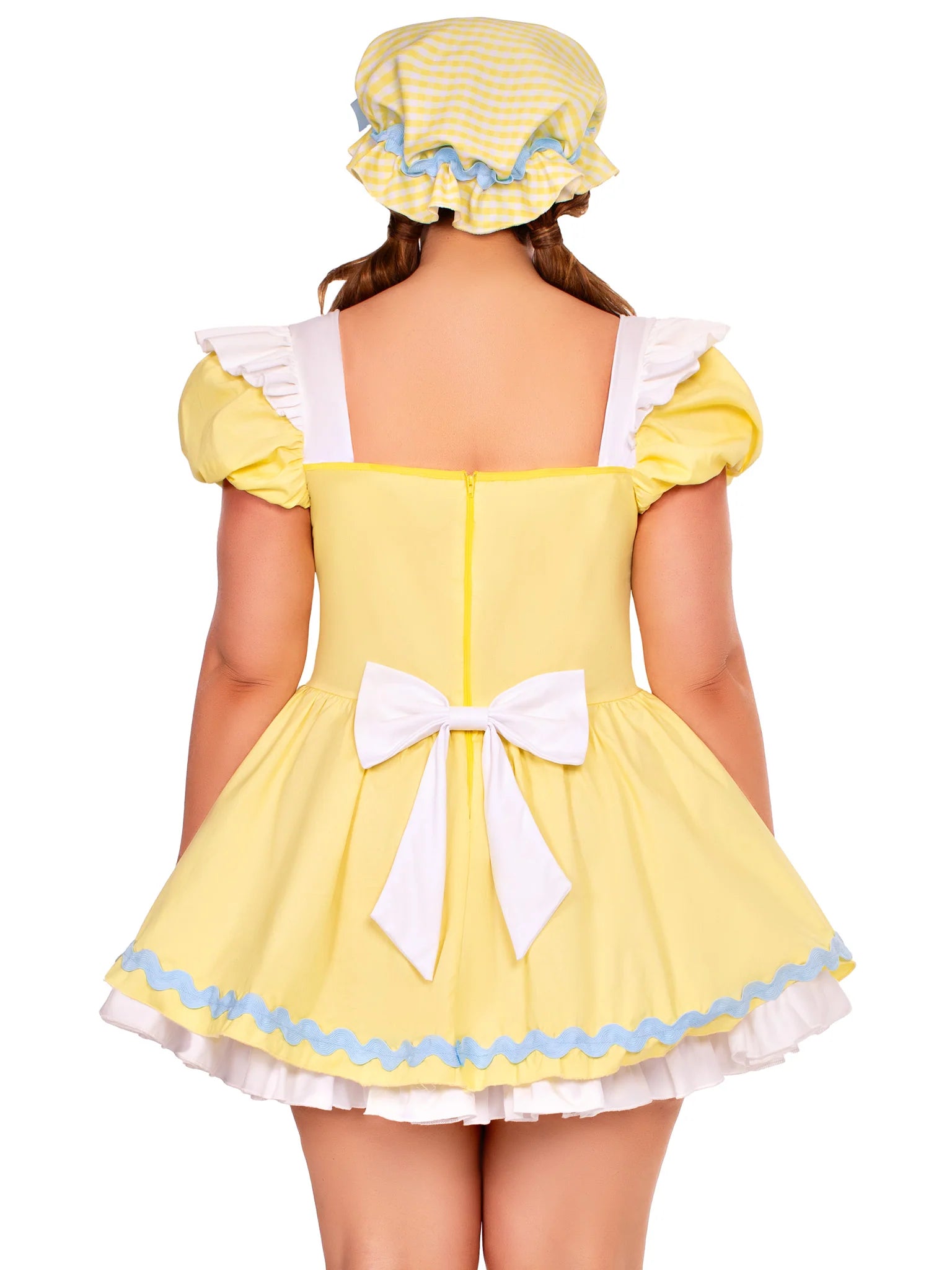 Incluye: vestido con delantal de volantes y parches de osito, moño para la espalda y cofia a juego.
